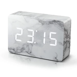 Features: sound activated or permanent display settings, alarm with snooze function, 5/7 days alarm setting, automatic dimmer function, 12/24 and Celsius/Fahrenheit formats can be selected, internal battery to keep you custom settings in case of power cut, charging adapter included