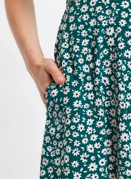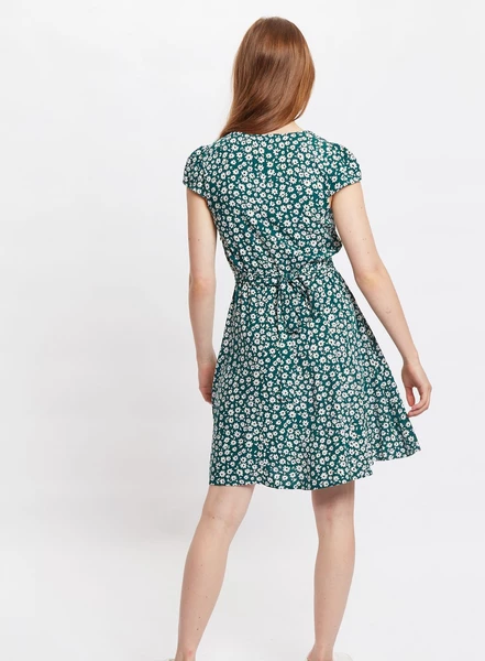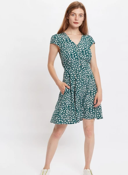 Inspired by a vintage tea dress, Louches favourite Cathleen dress will serve you well for seasons to come. Crafted in their flower sketch print in green, this style is simply the most flattering shape ever. Featuring cap sleeves, a fitted bodice with gold edged buttons, back tie waist to customise your fit and of course those deep side seam pockets we all truly love. Style with your ankle boots or trainers and let her be your forever dress. 100% Viscose Hand wash. Wash with similar colours. Do not bleach. Do not tumble dry. Warm Iron on reverse. Model is 5ft 6″/170cm tall and wears a size 8