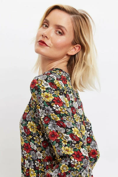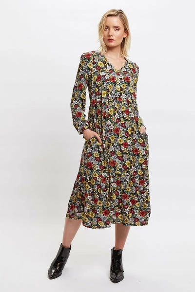 This long sleeve midi dress from Louche has a v neck and the side seam pockets that we love! The woodland walk print will add some much needed colour to your wardrobe at this time of year and we’re wearing it now with tights, chunky boots and a cardi. 100% Polyester Turn inside out. Machine wash in warm water with similar colours. Do not bleach. Do not tumble dry, Simply hang on a hanger to dry. Cool iron. Do not dry clean.