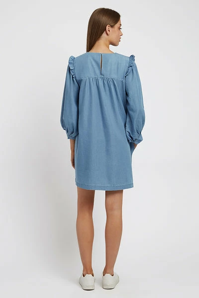 This throw on and go mini dress with elevated frill detail , ticks every trend box this season . Crafted in a washed oh so soft cotton tencel denim look fabric . Team with white trainers or ankle boots for a perfect work to weekend look.