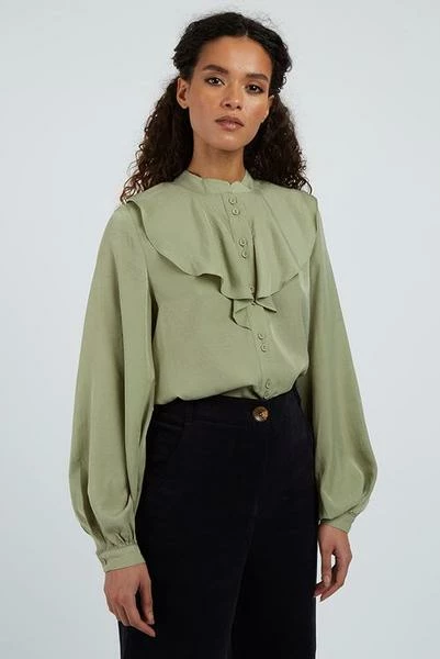 This soft green blouse with billowing sleeves and neck frill detail is just the thing to elevate your working wardrobe. Ideal for those Zoom meetings. Features delicate self covered buttons. 65% Cotton 35% Polyester. Turn inside out. Hand wash cycle. Wash with similar colours. Do not bleach.Do not tumble dry, Warm iron. Do not dry clean. Model is 5ft 5″/165cm tall and wears size8
