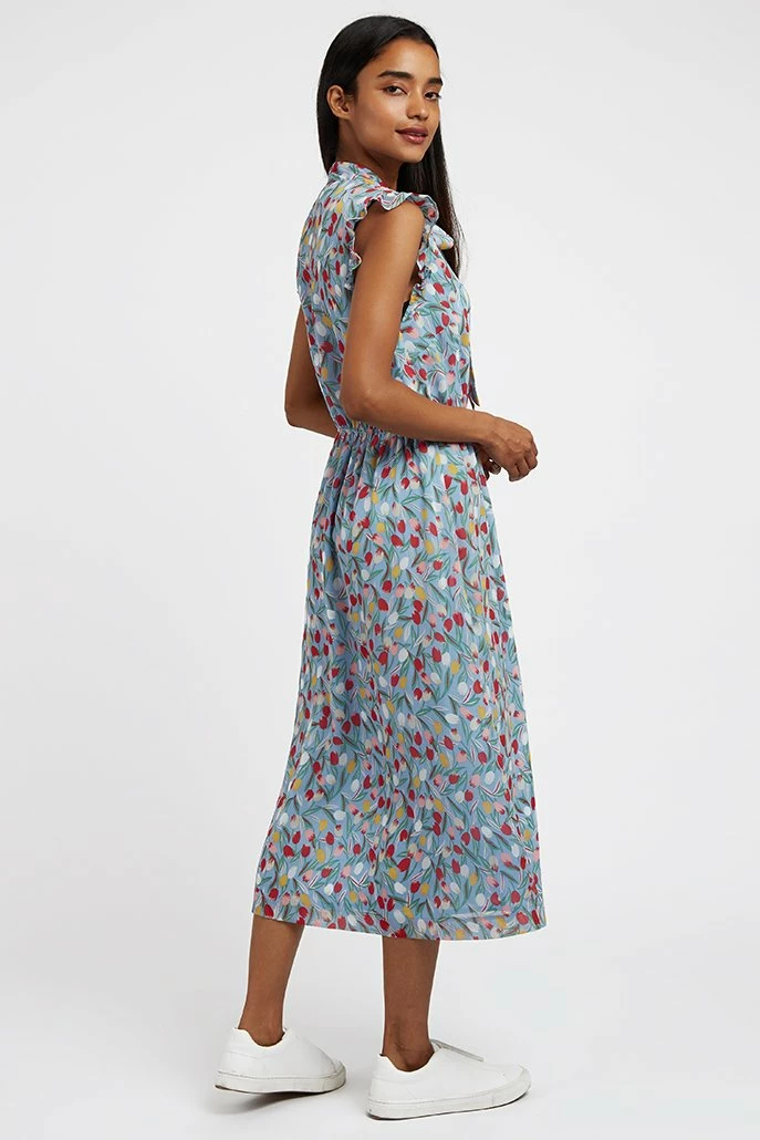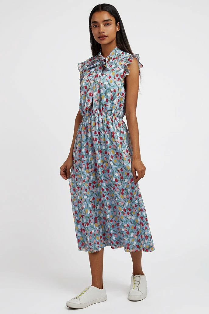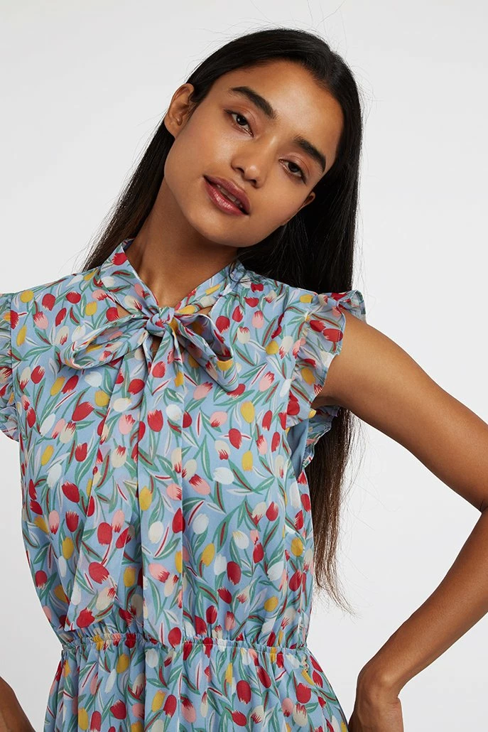 In a beautiful tulip print this midi dress has got retro romantic nailed. This soft printed georgette dress featuring a pussy cat bow neckline , frill armhole detail and flattering elasticated waistline is an ideal dress for that special occasion.