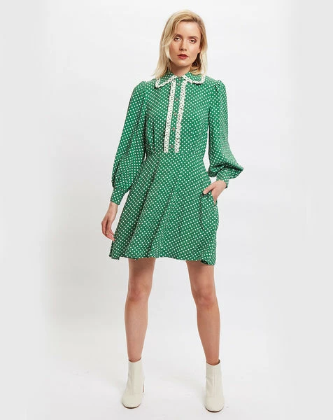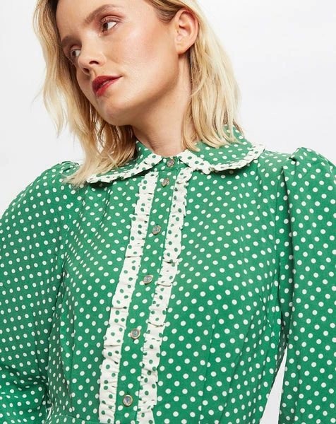 This new flattering Nancy dress featuring a statement contrast frill collar and placket, elasticated waist, and side seam pockets. Crafted in a green polka dot print in a luxurious polyester. Product Information: 100% Heavy Weight Polyester Wash Information: Turn inside out. Machine wash in warm water with similar colours. Do not bleach. Do not tumble dry, Simply hang on a hanger to dry. Cool iron. Do not dry clean.