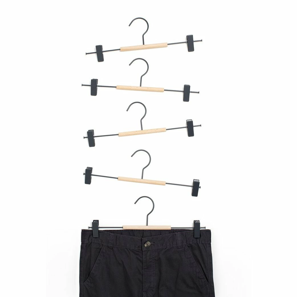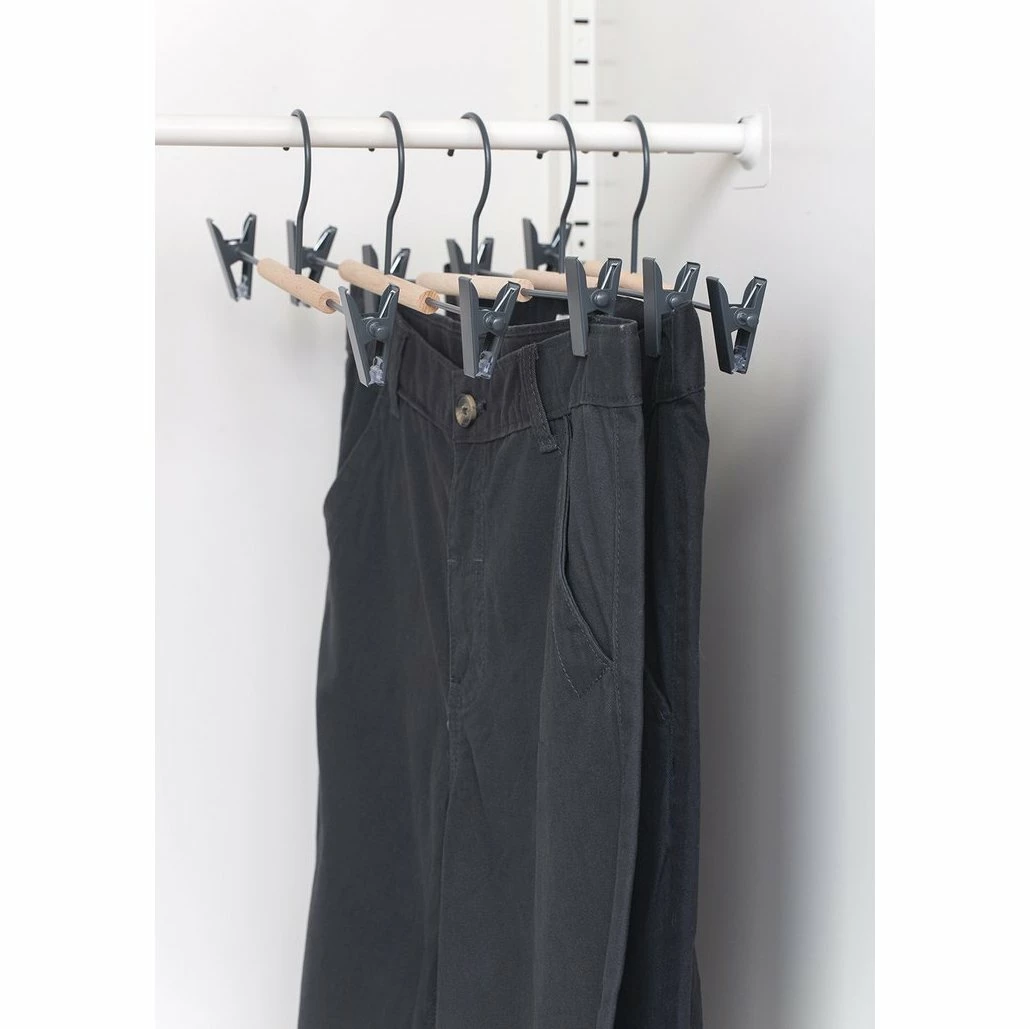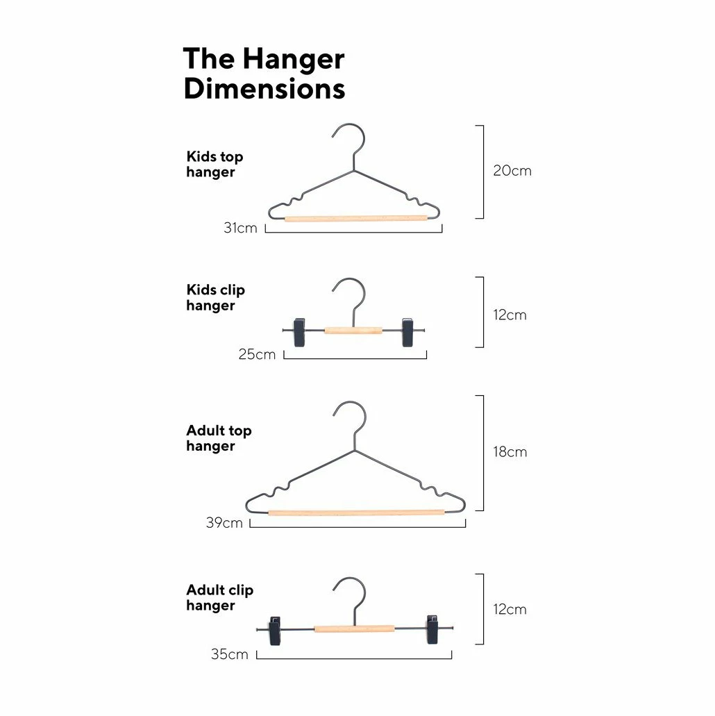 The hangers of your wardrobe dreams! Our fancy clip hangers have a smooth matte powder-coated finish, a timber detail + two clippy clips ready to hold your clothes just right. These hangers will fit perfectly in your Twinny or Skinny. Pack of 5 Measurements: Height 12cm, Width 35cm
