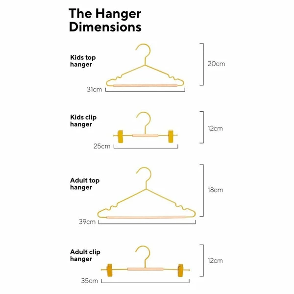Mustard Made: Adult Clip Hangers (Various Colours). The hangers of your wardrobe dreams! Our fancy clip hangers have a smooth matte powder-coated finish, a timber detail + two clippy clips ready to hold your clothes just right.These hangers will fit perfectly in your Twinny or Skinny.Pack of 5Measurements +Height 12cmWidth 35cmAvailable in Berry, Blush, Mustard, Navy, Ocean, Olive, Sage, Slate, Lilac and White.
