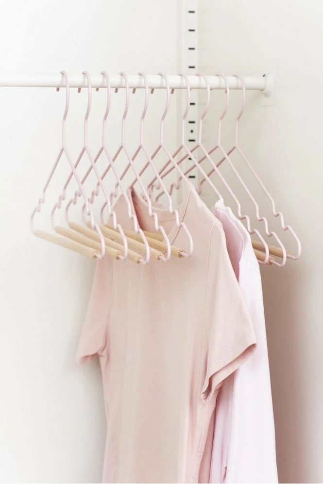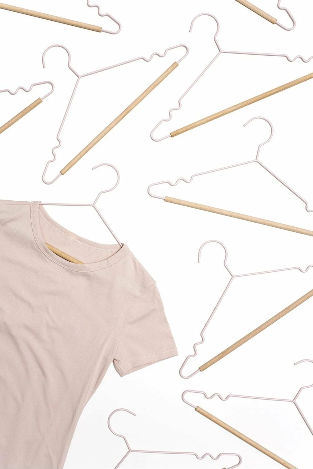 Hangers Blush Set of 10 Smooth matte powder-coated finish Timber detail Mustard signature squiggle on the side These hangers erfect fit the skinny locker Height: 20cm Width: 38.5cm 41359