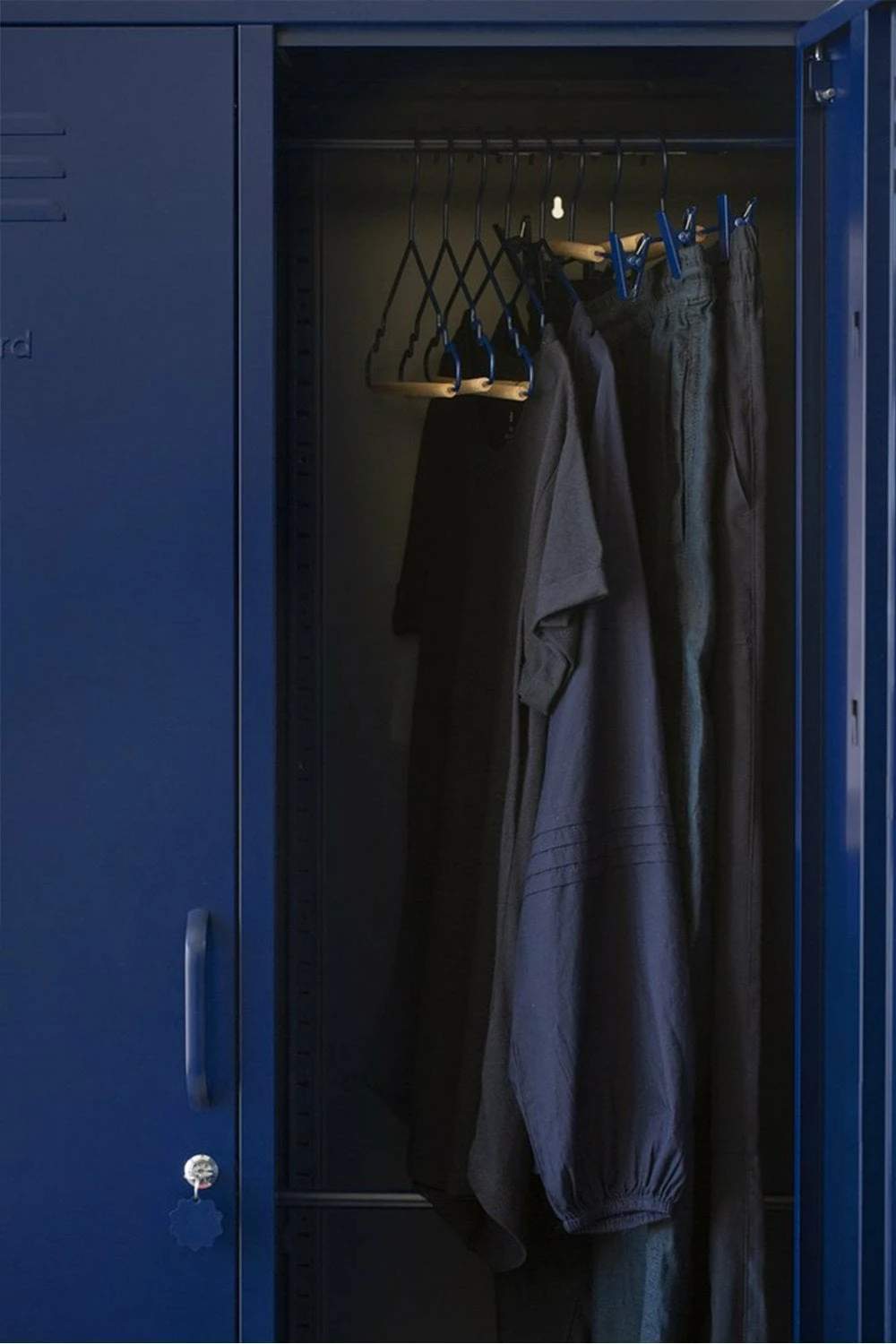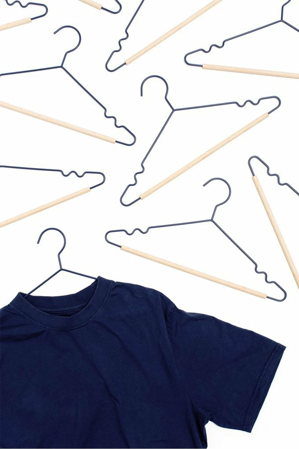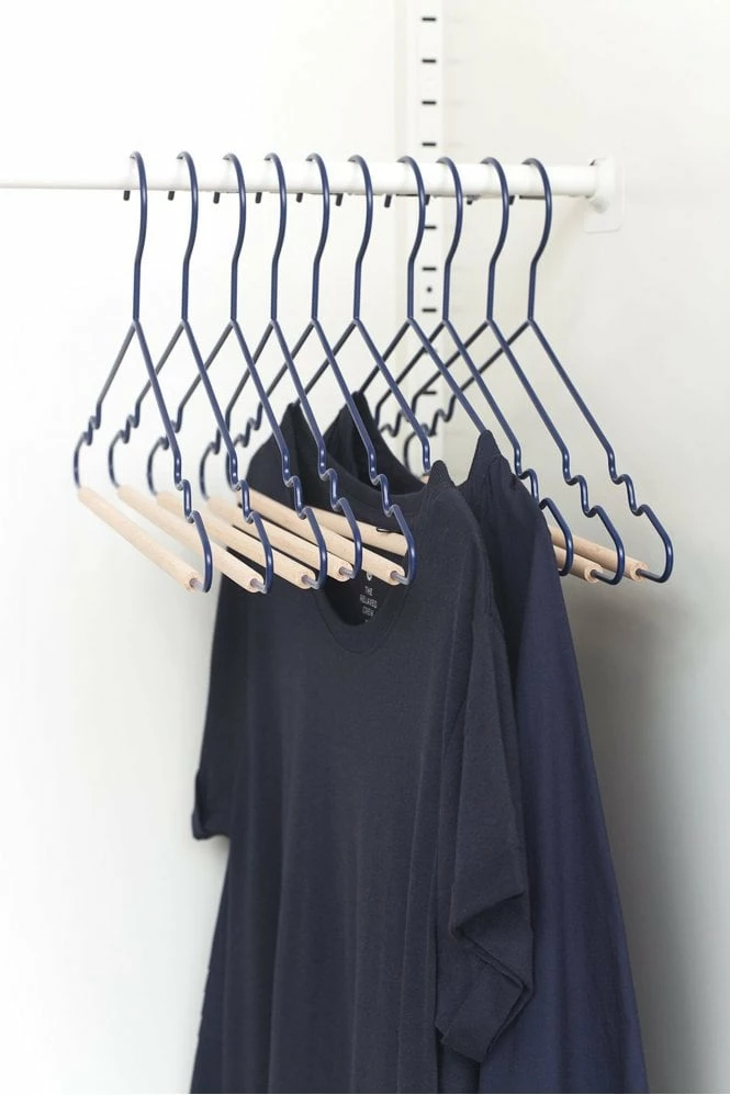 Hangers Navy Set of 10 Smooth matte powder-coated finish Timber detail Mustard signature squiggle on the side These hangers erfect fit the skinny locker Height: 20cm Width: 38.5cm 41359