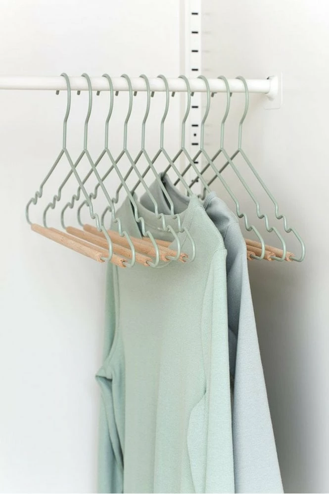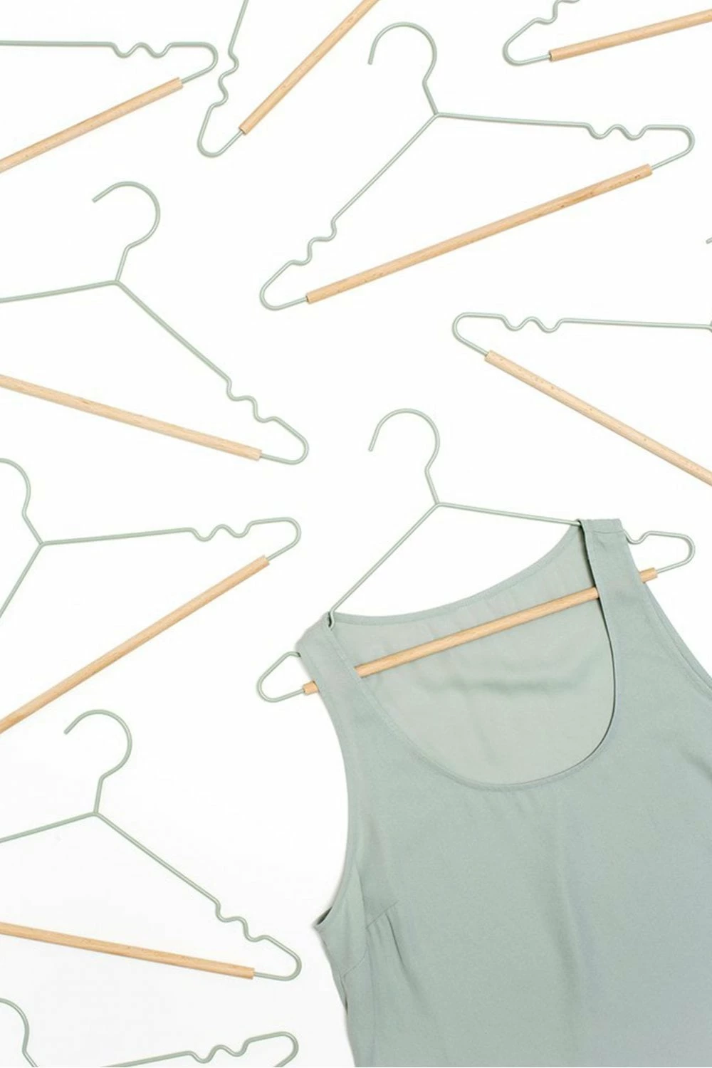 Hangers Sage Set of 10 Smooth matte powder-coated finish Timber detail Mustard signature squiggle on the side These hangers erfect fit the skinny locker Height: 20cm Width: 38.5cm 41359
