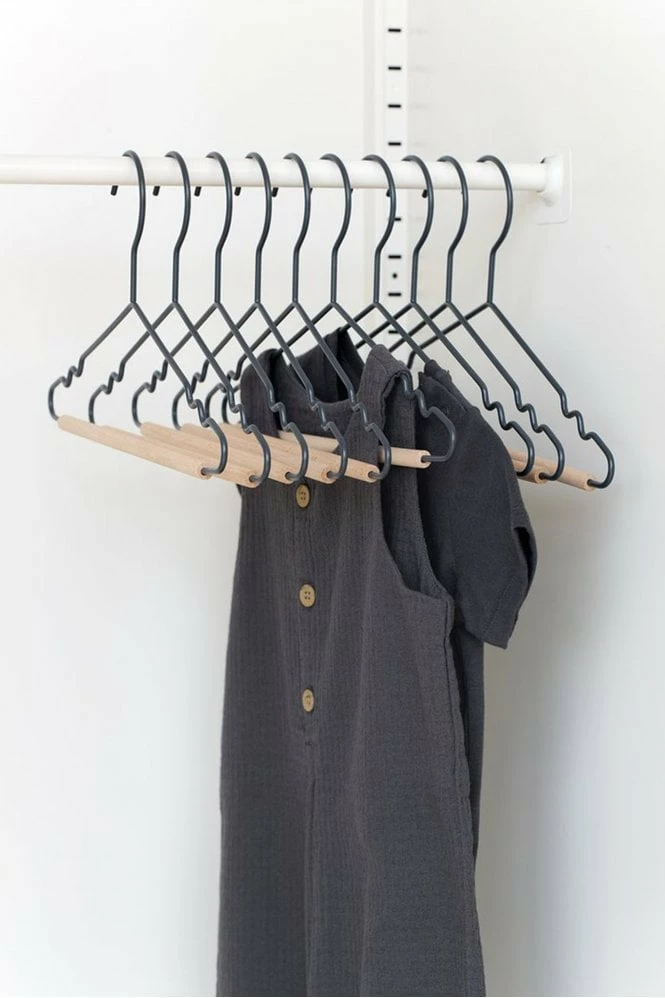 Hangers Slate Set of 10 Smooth matte powder-coated finish Timber detail Mustard signature squiggle on the side These hangers erfect fit the skinny locker Height: 20cm Width: 38.5cm 41359