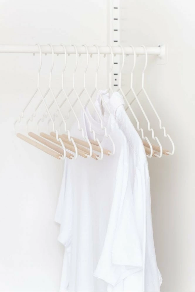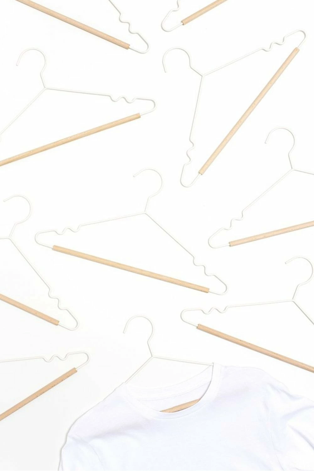 Hangers White Set of 10 Smooth matte powder-coated finish Timber detail Mustard signature squiggle on the side These hangers erfect fit the skinny locker Height: 20cm Width: 38.5cm 41359