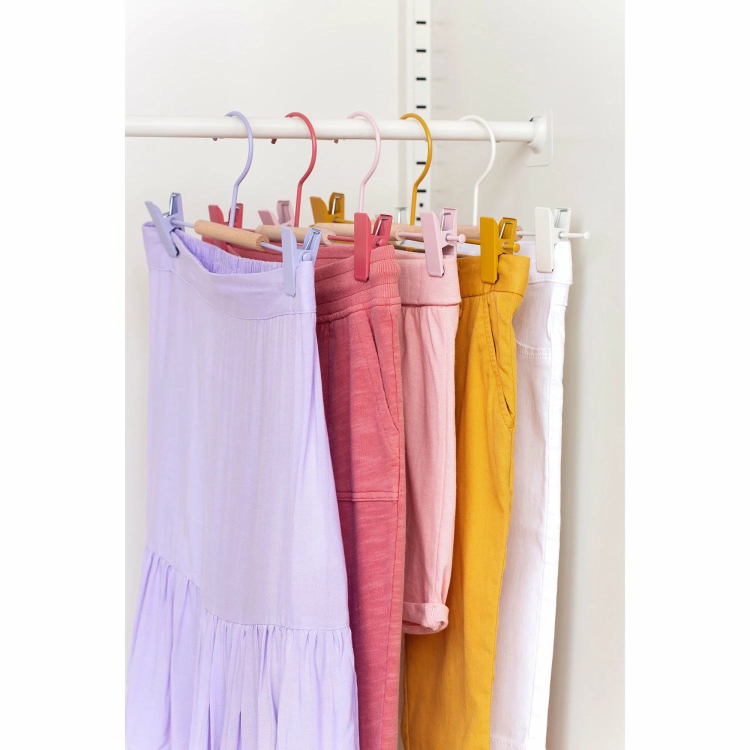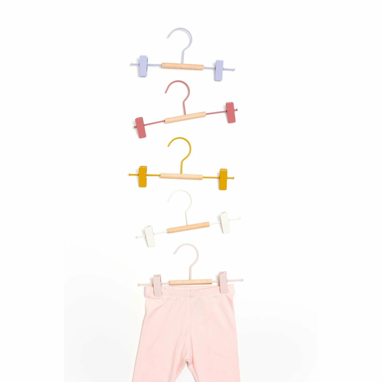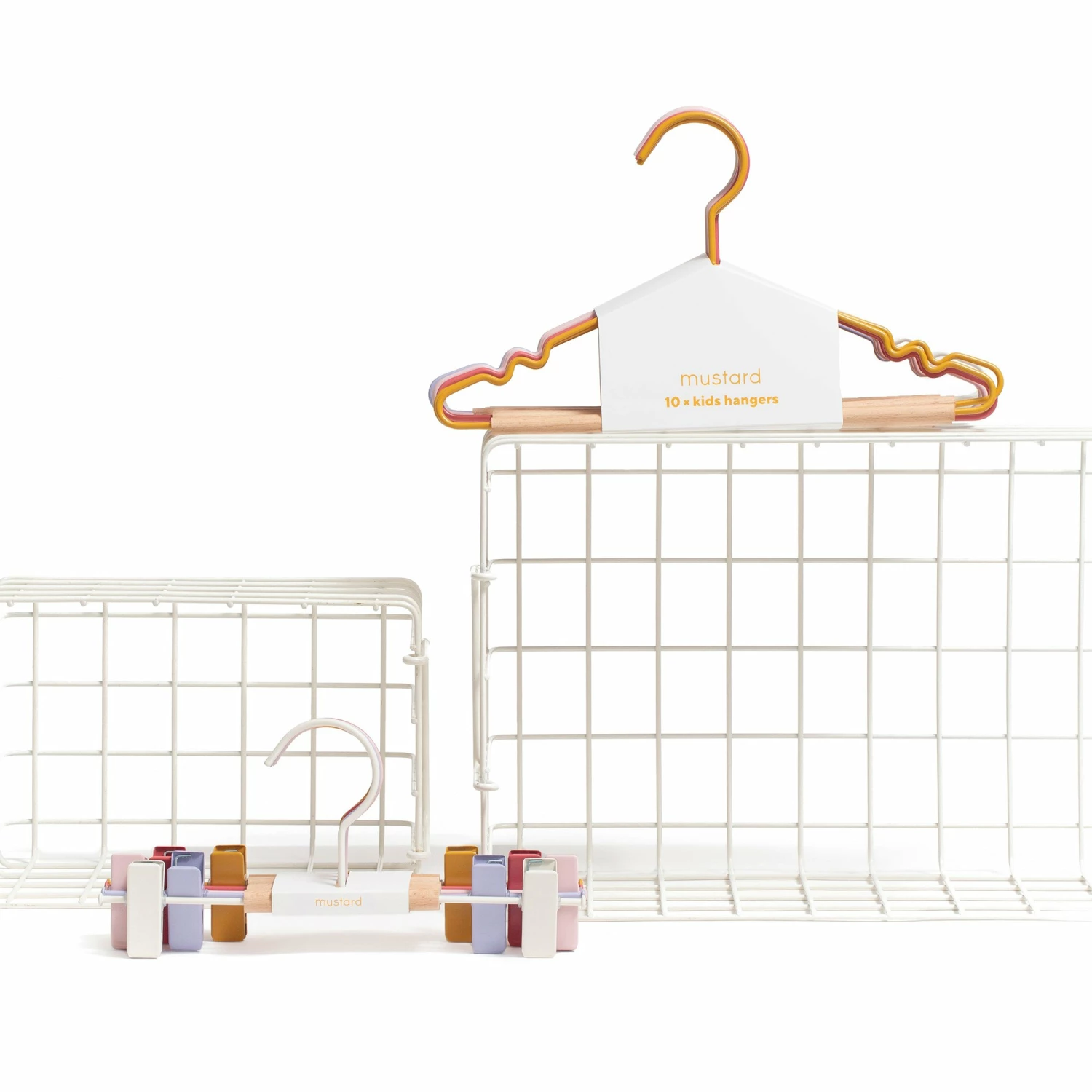 Say hello to the cutest hangers for your little people! Our fancy clip hangers have a smooth matte powder-coated finish, a timber detail + two clippy clips ready to hold your clothes just right. These hangers will fit perfectly in your Twinny or Skinny. Comes in a pack of five in Blush, Berry, Lilac, Mustard and White Pack of 5 Measurements: Height 12cm, Width 25cm