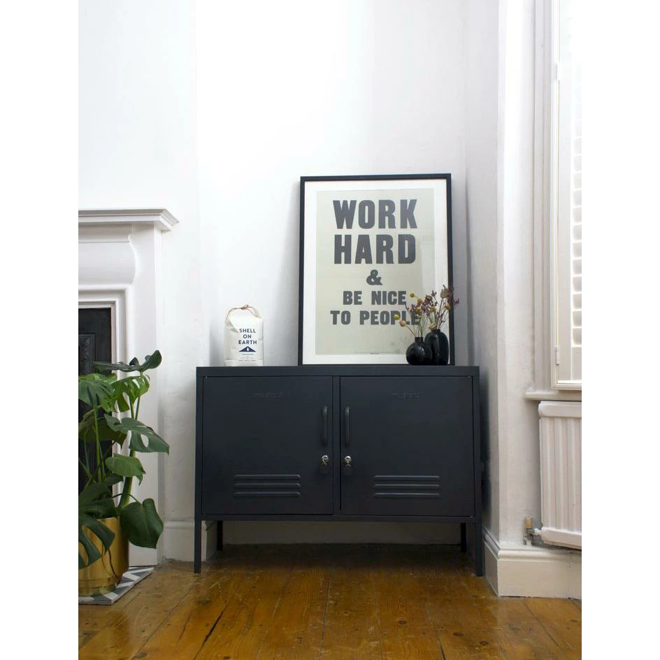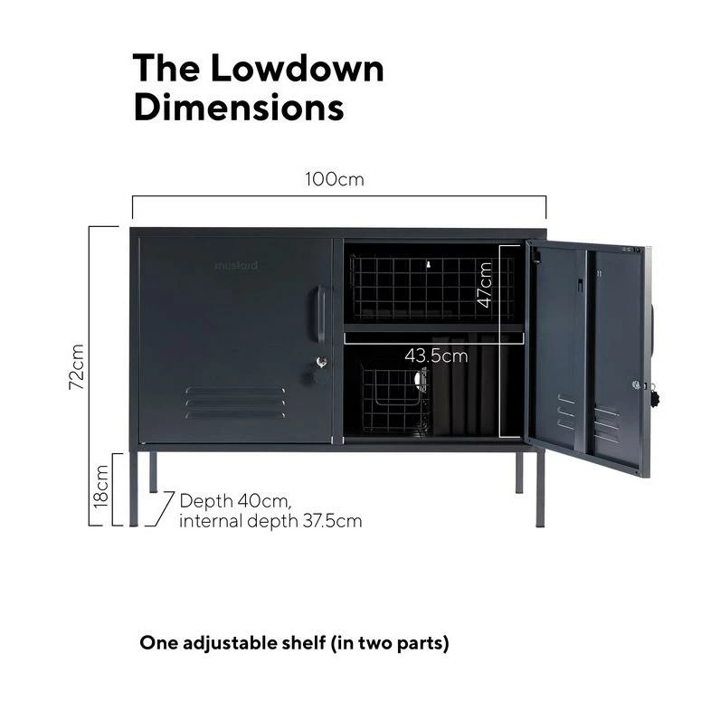 BACK IN APRIL The Lowdown locker is your new favourite console, tv station or office storage. Standing at the same height as The Shorty, she’s wider but a little less deep. Inside: One adjustable shelf (in two parts), two handy hook, cable hole, wall attachment points. Outside: Handles, locks, custom keyrings, mustard logo, air vents. Measurements: Height 72cm, Width 100cm, Depth 40cm Build it: The lockers are cleverly designed to arrive flat packed for you to assemble. Check out Mustards’ videos to see how! Colour: The last image shows the colour of this locker as best as we can digitally. Colours will vary on different screens + lighting will change how the colour looks in your space.