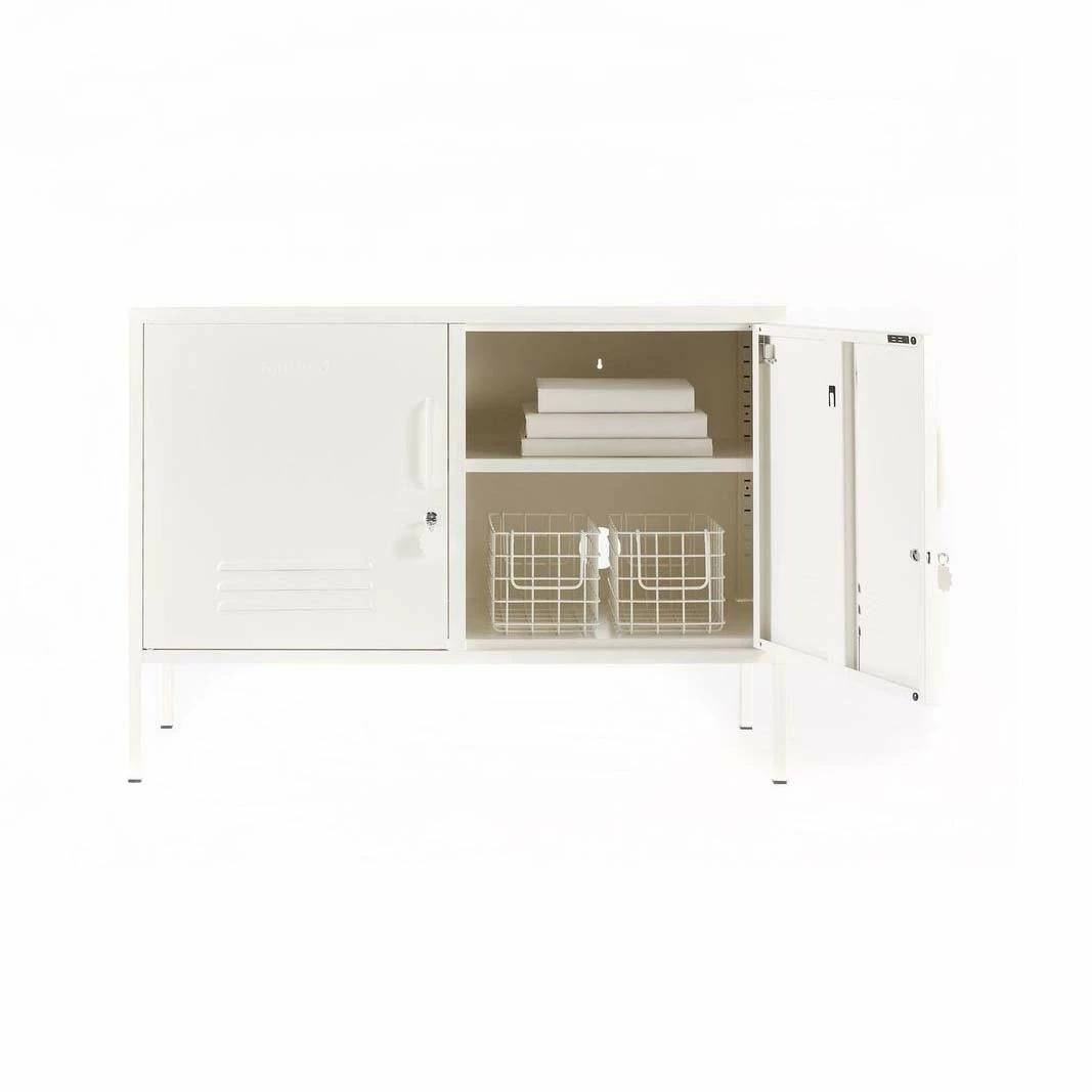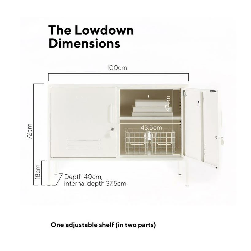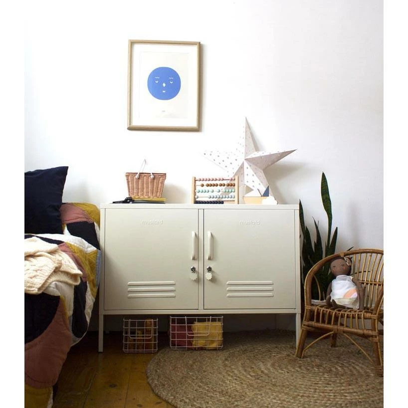 The Lowdown locker is your new favourite console, tv station or office storage. Standing at the same height as The Shorty, she’s wider but a little less deep. Inside: One adjustable shelf (in two parts), two handy hook, cable hole, wall attachment points. Outside: Handles, locks, custom keyrings, mustard logo, air vents. Measurements: Height 72cm, Width 100cm, Depth 40cm Build it: The lockers are cleverly designed to arrive flat packed for you to assemble. Check out Mustards’ videos to see how! Colour: The last image shows the colour of this locker as best as we can digitally. Colours will vary on different screens + lighting will change how the colour looks in your space.