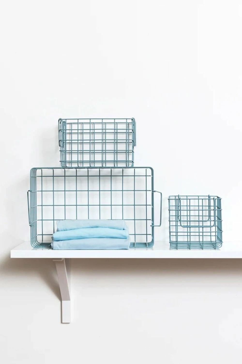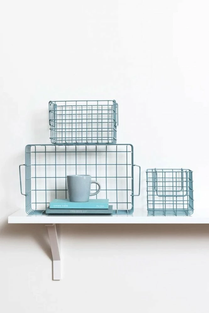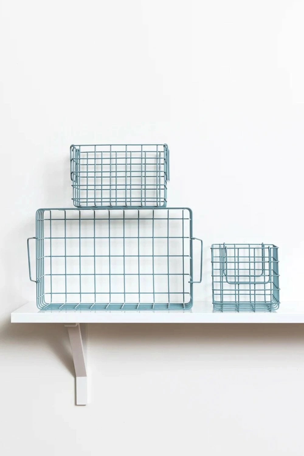 Mustard Made Set of 3 Baskets Ocean Metal 39397 Small: H 16cm x W 17cm x L 24.4cm Medium: H 16cm x W 26cm x L 40cm The Set of 3 Baskets in Ocean by Mustard Made are the perfect storage solution for your Mustard Made Locker or just to use on a shelf or cupboard. The metal set comes with two small and one medium baskets and available in this beautiful blue shade, as well as a selection of mix and match colours.