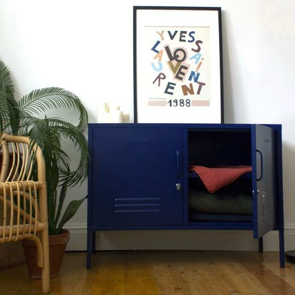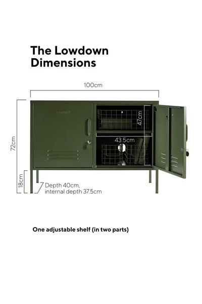 The Lowdown locker is your new favourite console, tv station or office storage. It’s the style that I have in the shop and also as our TV unit at home. Standing at the same height as The Shorty, she’s wider but a little less deep. Our White has a slightly cream tone and not a pure white. Inside + One adjustable shelf (in two parts), two handy hook, cable hole, wall attachment points. Outside + Handles, locks, custom keyrings, mustard logo, air vents. Measurements + Height 72cm Width 100cm Depth 40cm Build it + Our lockers are cleverly designed to arrive flat packed for you to assemble. Check out our videos to see how! Colour + We have attached a range of images to try to show the colour the best we can digitally. Colours vary on different screens and devices. If you wish to see the lockers in real life we have a range in store as well as all the metal colour swatches we can show you. Delivery + Please allow up to 10 days delivery for Mustard Made lockers.