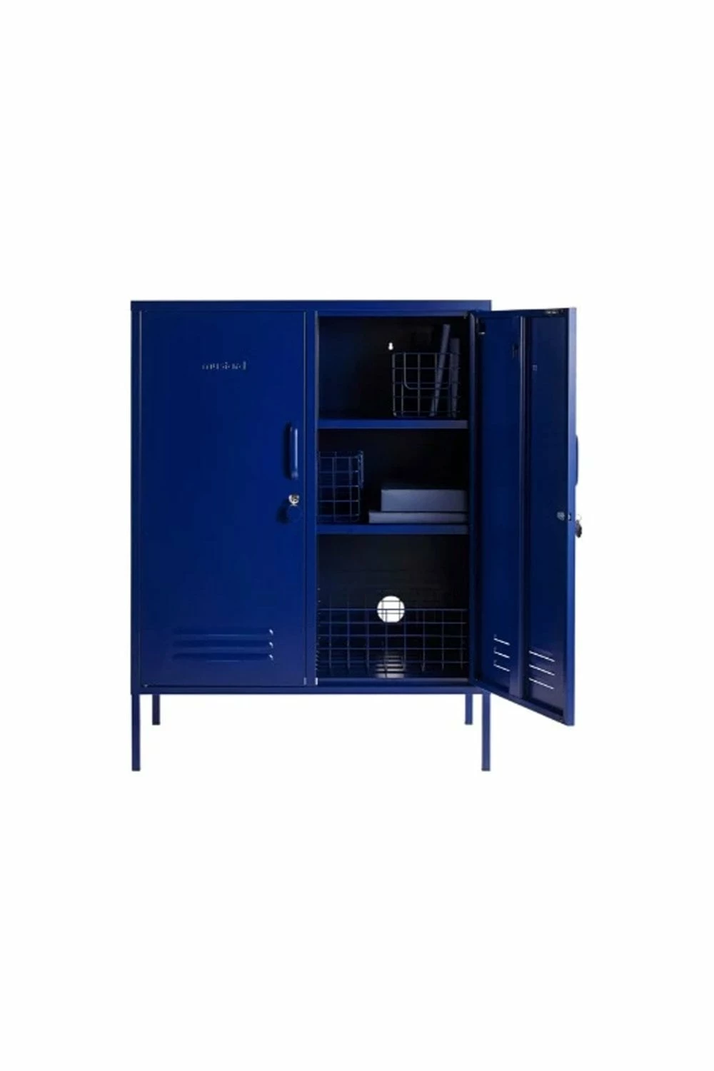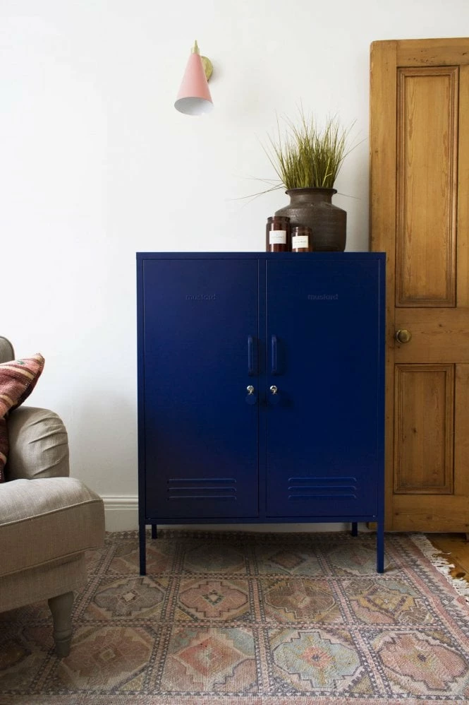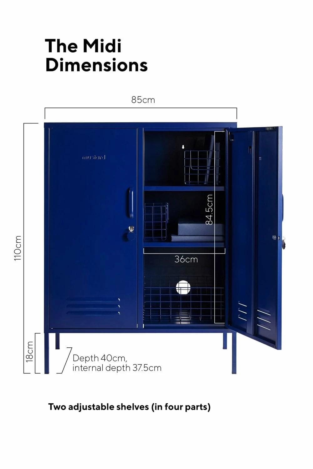 Navy Two adjustable shelves Two hooks Cable hole Safety wall screw holes Handles Magnetic closure Lock and key with Mustard logo fob Air vents Height 110cm Width 85cm Depth 40cm Comes flat packed Product Code: 36941 Navy