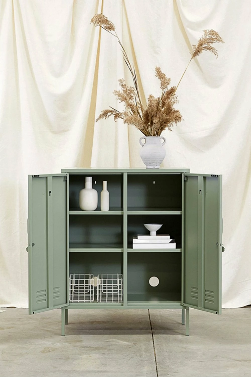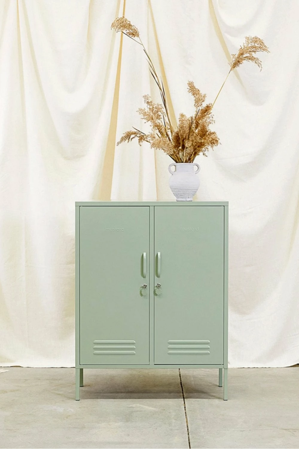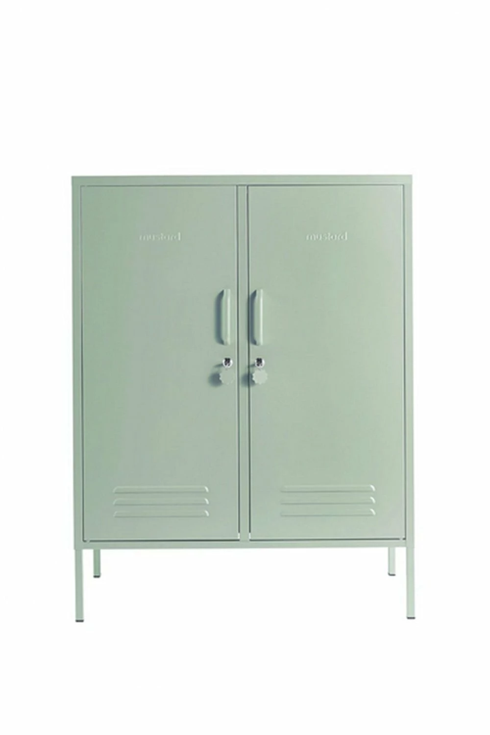 Sage green Two adjustable shelves Two hooks Cable hole Safety wall screw holes Handles Magnetic closure Lock and key with Mustard logo fob Air vents Height 110cm Width 85cm Depth 40cm Comes flat packed Product Code: 36941 Sage We are sure that you will love your Mustard Locker but if you change your mind we can accept a return within 30 days of purchase if the product is unopened + has not been assembled. We are unable to offer a refund or exchange after this period.