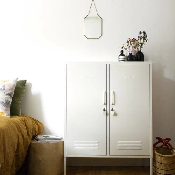 The Midi locker has maximum storage potential. Use her as a toy cupboard, in the kitchen or hiding all the shoes + umbrellas in the hallway. Our White shade has a slightly cream tone and is not a pure bright white. Inside + Two adjustable shelves (in four parts), two handy hook, cable hole, wall attachment points. Outside + Handles, locks, custom keyrings, mustard logo, air vents. Measurements + Height 110cm Width 85cm Depth 40cm Build it + Our lockers are cleverly designed to arrive flat packed for you to assemble. Check out our videos to see how! Colour +We have attached a range of images to try to show the colour the best we can digitally. Colours vary on different screens and devices. If you wish to see the lockers in real life we have a range in store as well as all the metal colour swatches we can show you. Delivery + Please allow up to 10 days delivery for Mustard Made lockers.