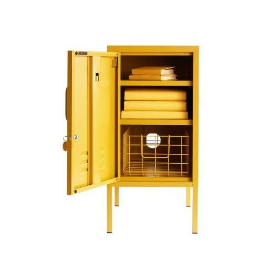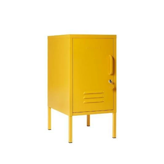 Door opens to the left The Shorty in Mustard locker makes itself at home tucked neatly next to your desk, snuggled up next to your lounge or sitting beside your bed. Inside: Two adjustable shelves, one handy hook, cable hole, wall attachment points. Outside: Handle, lock, custom keyring, mustard logo, air vents. Measurements: Height 72cm, Width 35cm, Depth 46cm Build it: The lockers are cleverly designed to arrive flat packed for you to assemble. Check out Mustards’ videos to see how! Colour: The last image shows the colour of this locker as best as we can digitally. Colours will vary on different screens + lighting will change how the colour looks in your space. We recommend getting yourself a colour swatch so you can see the exact colour + finish in real life before purchasing.