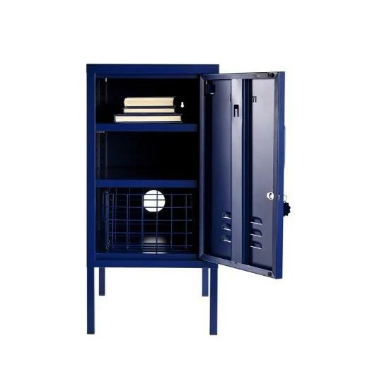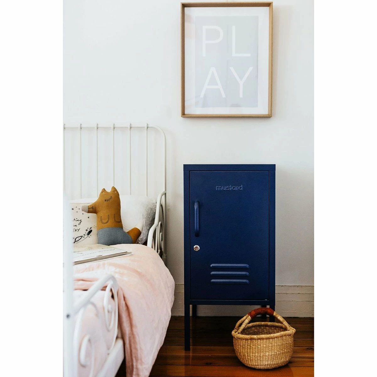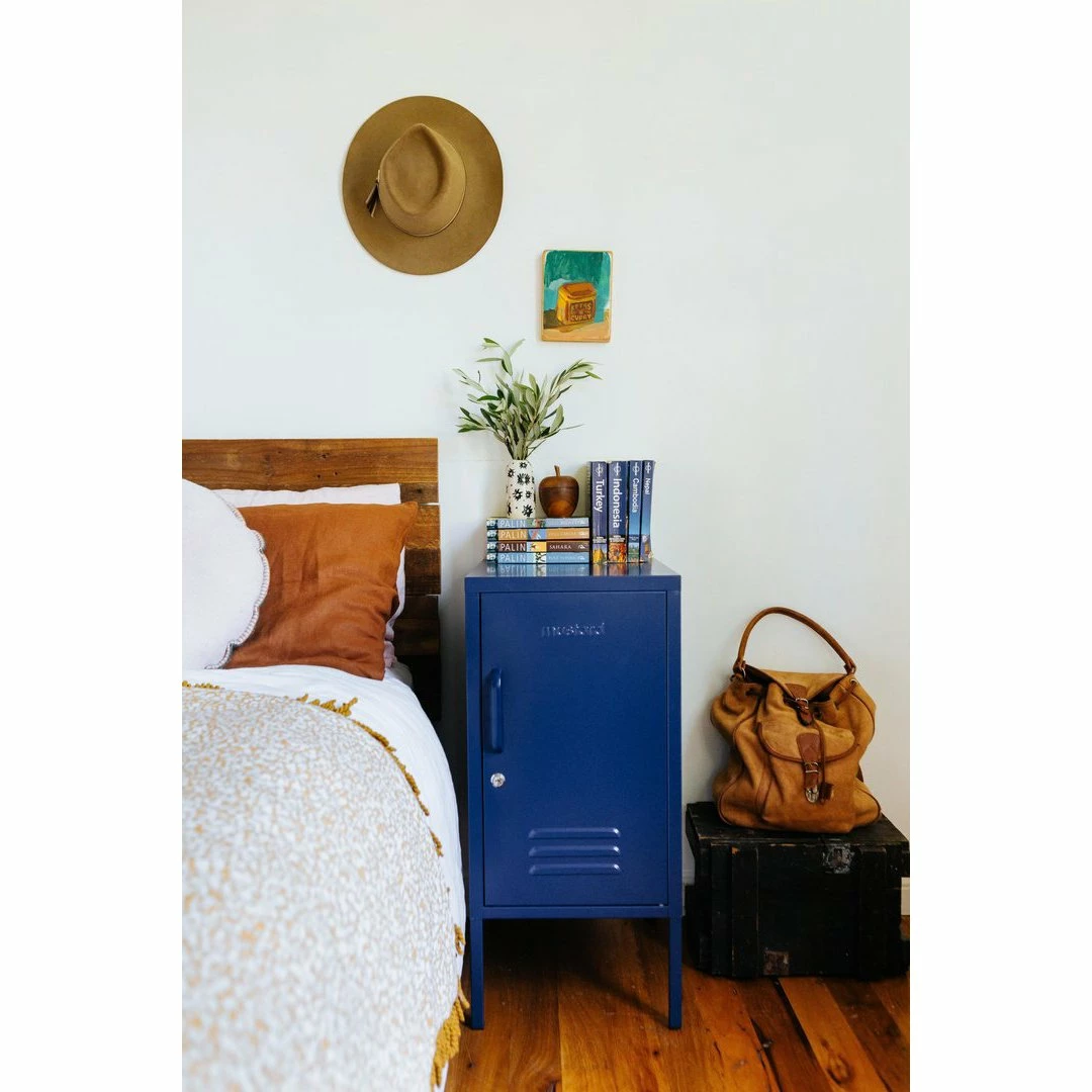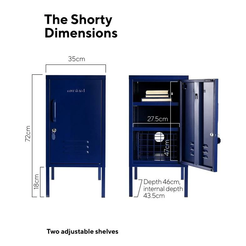 The Shorty in Navy locker makes itself at home tucked neatly next to your desk, snuggled up next to your lounge or sitting beside your bed. Inside: Two adjustable shelves, one handy hook, cable hole, wall attachment points. Outside: Handle, lock, custom keyring, mustard logo, air vents. Measurements: Height 72cm, Width 35cm, Depth 46cm Build it: The lockers are cleverly designed to arrive flat packed for you to assemble. Check out Mustards’ videos to see how! Colour: The last image shows the colour of this locker as best as we can digitally. Colours will vary on different screens + lighting will change how the colour looks in your space. We recommend getting yourself a colour swatch so you can see the exact colour + finish in real life before purchasing.