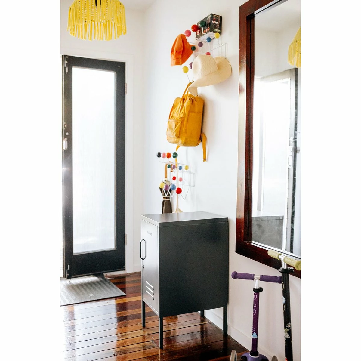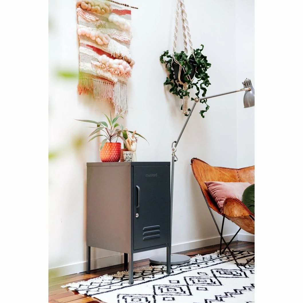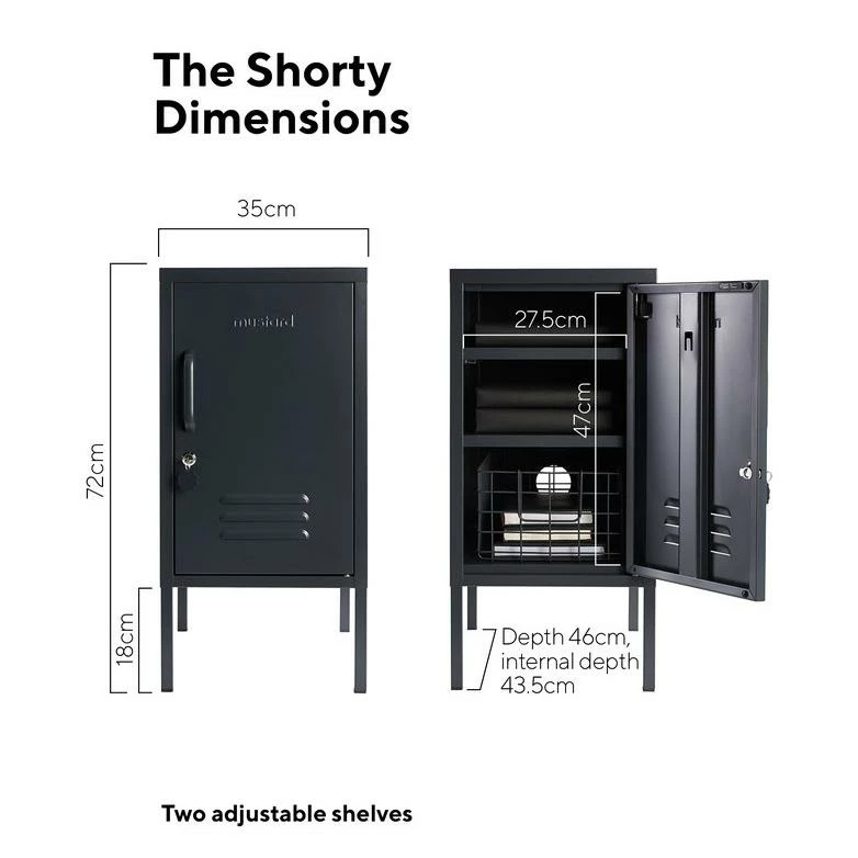 The Shorty in Slate locker makes itself at home tucked neatly next to your desk, snuggled up next to your lounge or sitting beside your bed. Inside: Two adjustable shelves, one handy hook, cable hole, wall attachment points. Outside: Handle, lock, custom keyring, mustard logo, air vents. Measurements: Height 72cm, Width 35cm, Depth 46cm Build it: The lockers are cleverly designed to arrive flat packed for you to assemble. Check out Mustards’ videos to see how! Colour: The last image shows the colour of this locker as best as we can digitally. Colours will vary on different screens + lighting will change how the colour looks in your space. We recommend getting yourself a colour swatch so you can see the exact colour + finish in real life before purchasing.