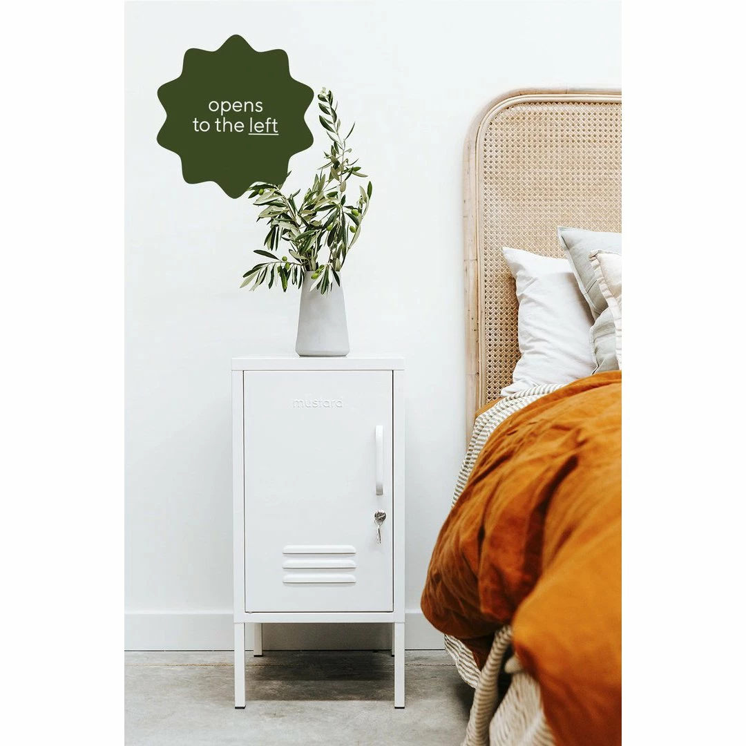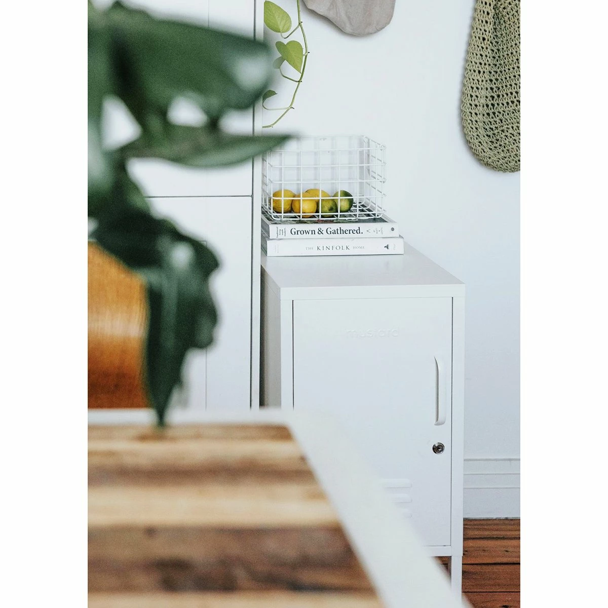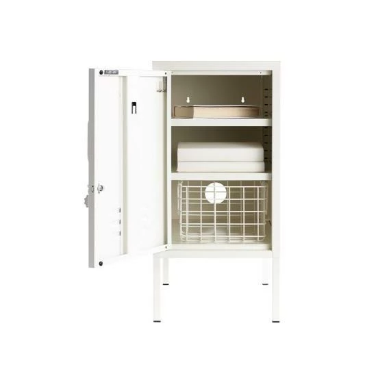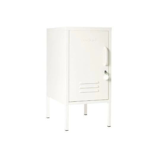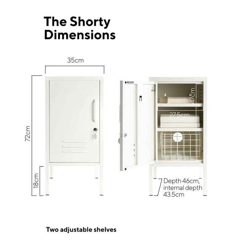 Door opens to the left The Shorty in White locker makes itself at home tucked neatly next to your desk, snuggled up next to your lounge or sitting beside your bed. Inside: Two adjustable shelves, one handy hook, cable hole, wall attachment points. Outside: Handle, lock, custom keyring, mustard logo, air vents. Measurements: Height 72cm, Width 35cm, Depth 46cm Build it: The lockers are cleverly designed to arrive flat packed for you to assemble. Check out Mustards’ videos to see how! Colour: The last image shows the colour of this locker as best as we can digitally. Colours will vary on different screens + lighting will change how the colour looks in your space. We recommend getting yourself a colour swatch so you can see the exact colour + finish in real life before purchasing.