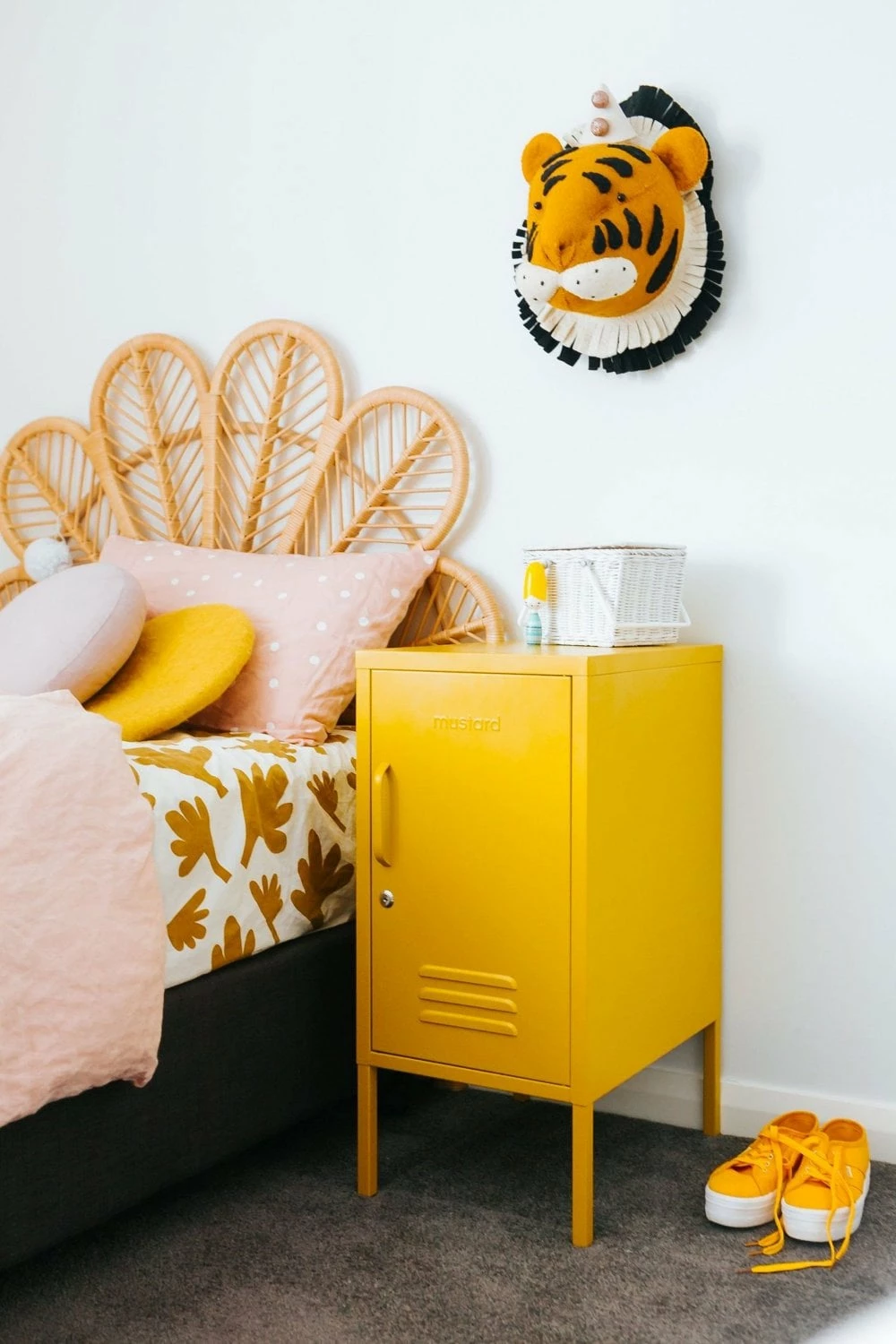 Height 72cm Width 35cm Depth 46cm Comes flat packed Give your home a vibrant pop of colour with Mustard Made’s The Shorty Locker in Mustard. This playful storage option will lend a distinctly retro vibe to the room with its classic locker style, whilst providing a clever (and lockable!) storage option. With two adjustable shelves, a hook and a cable hole that allows for electronics, this mustard yellow locker is the ideal size for use as an accent table in the lounge or bedside table topped with your favourite books. We are sure that you will love your Mustard Locker but if you change your mind we can accept a return within 30 days of purchase if the product is unopened + has not been assembled. We are unable to offer a refund or exchange after this period. Mustard yellow Two adjustable shelves One hook Cable hole Safety wall screw holes Handle Magnetic closure Lock and key with Mustard logo fob Air vents Product Code: 34732 Mustard